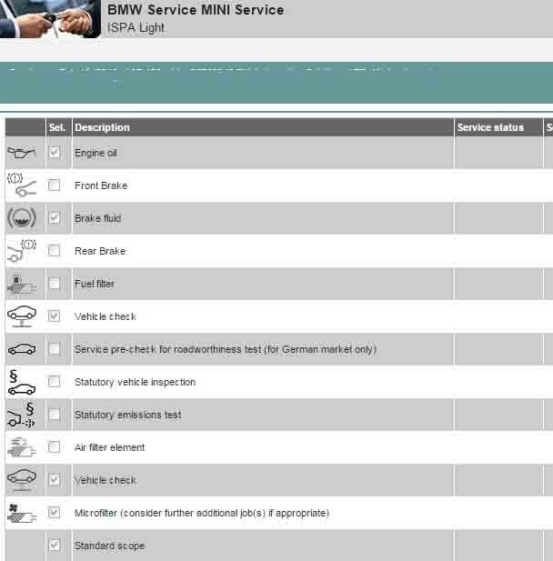 Maintenance items monitored by CBS can be viewed via the dashboard (early models), or via the iDrive screen (late models). The displayed maintenance items are engine oil, front and rear brake pad service, brake fluid and cabin microfilter. You can access these items and view the remaining time/mileage until service.